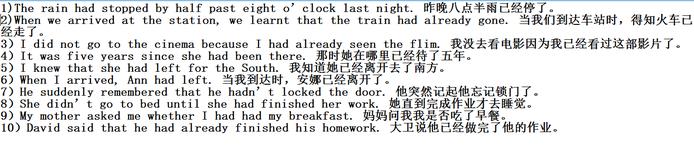 过去完成时:以过去某个时间为标准,在此以前发生的动作或行为,或在过去某动作之前完成的行为,即“过去的过去”。一般比较少用,常用在复合句中,句中一般有明确的过去时间,过去完成时的动词表示在过去某个明确的时间点之前已经完成的动作。