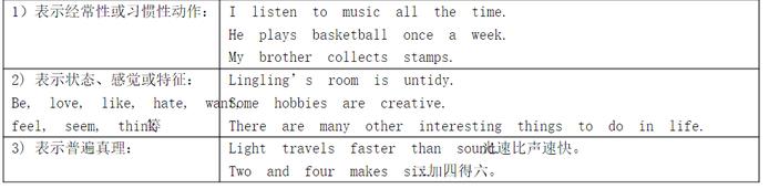 一般现在时:表示经常性的习惯动作,现在的特征或状态,和普遍真理的时候,谓语动词用一般现在时。