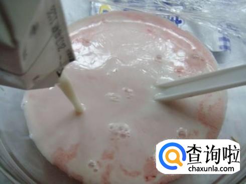 然后把切好的草莓倒入溶液中,用勺子搅拌均匀,使草莓块散开,最后装入干净的布丁瓶中,放入冰箱保鲜层冷却至凝固即可