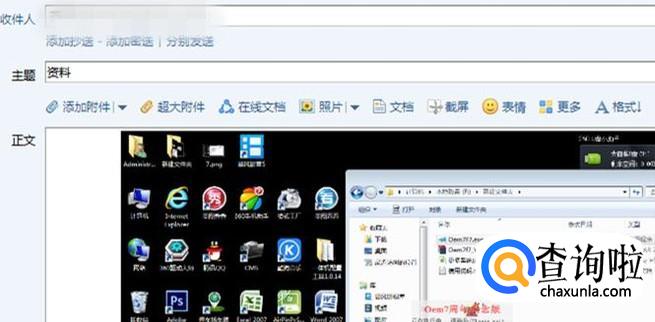 在上面第一行输入收信人的电子邮箱地址,第二行输入标题。下面是输入正文的地方,如果想要添加图片,就点正文上面的“照片”,要添加附件,就点“添加附件”。