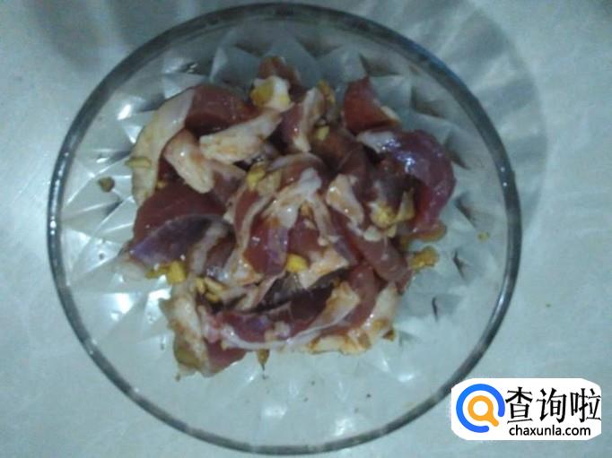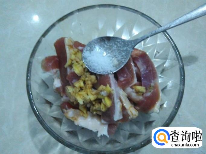 瘦肉切成粗丝,加适量的盐、姜蓉、1勺生抽、1勺料酒腌制几分钟。