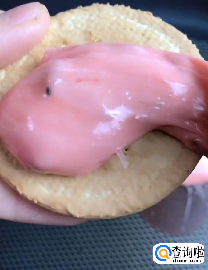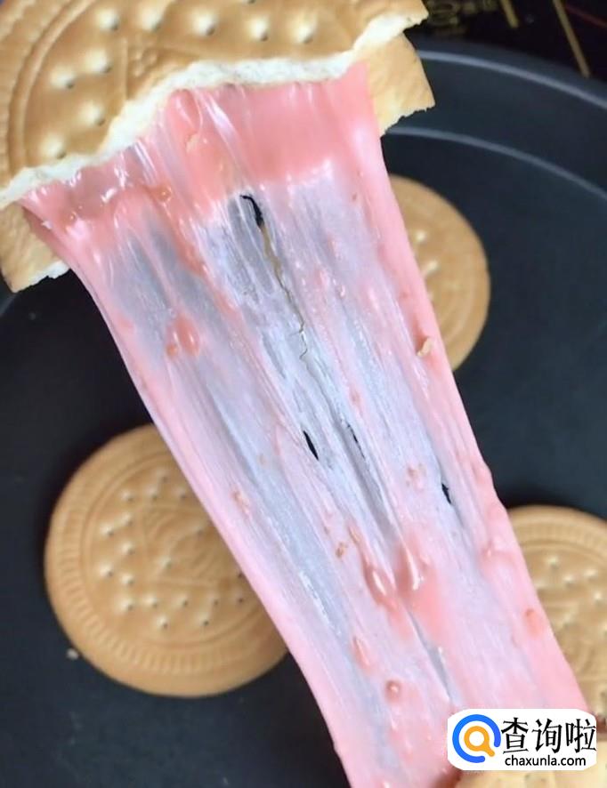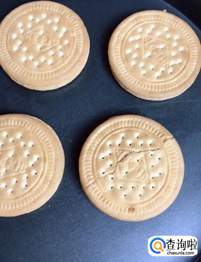 然后我们将炒好的棉花糖放在一块饼干上面,放好以后再盖上一张