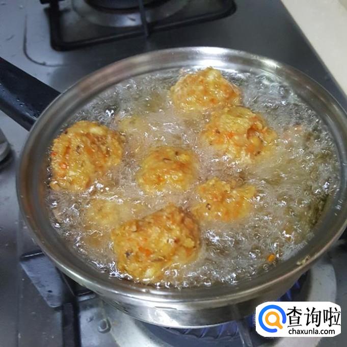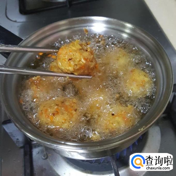锅烧热,加入适量的油,烧至7成热,把搅拌好的材料弄成一个小圆球,放入锅内炸
