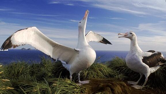 漂泊信天翁一生有十分之九的时间生活在海上。漂泊信天翁6-7岁时成年,雌鸟才开始产卵,幼鸟羽毛丰满后便开始了终生的海上漂泊。信天翁多生活在南半球。在南纬40度的地带,每月有27天是猛烈西风掀起巨浪的日子,这里是信天翁的理想天堂。它常利用西风从西向东作长距离的飞行,10个月飞行1.5万千米。无风时在海面休息,夜间在海面浮游。漂泊信天翁4岁以后就能准确地飞向自己的出生地,开始寻找配偶,一般要“考察"一两年,才能认定这门“婚事"。六到七岁时,成年的漂泊信天翁雌鸟开始产卵。幼鸟羽毛丰满后会逐渐独立,开始终生的海上漂泊。