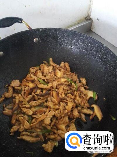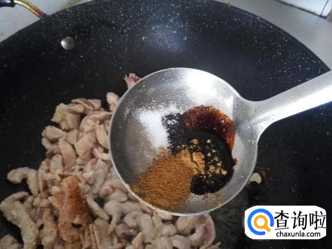 待油烧热,倒入我们切好的肉丝进行翻炒,并加入十三香,盐,老抽,继续翻炒。
