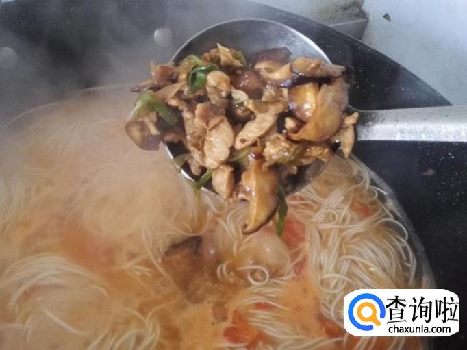当面煮至九分熟时,加入我们炒好的香菇肉丝。