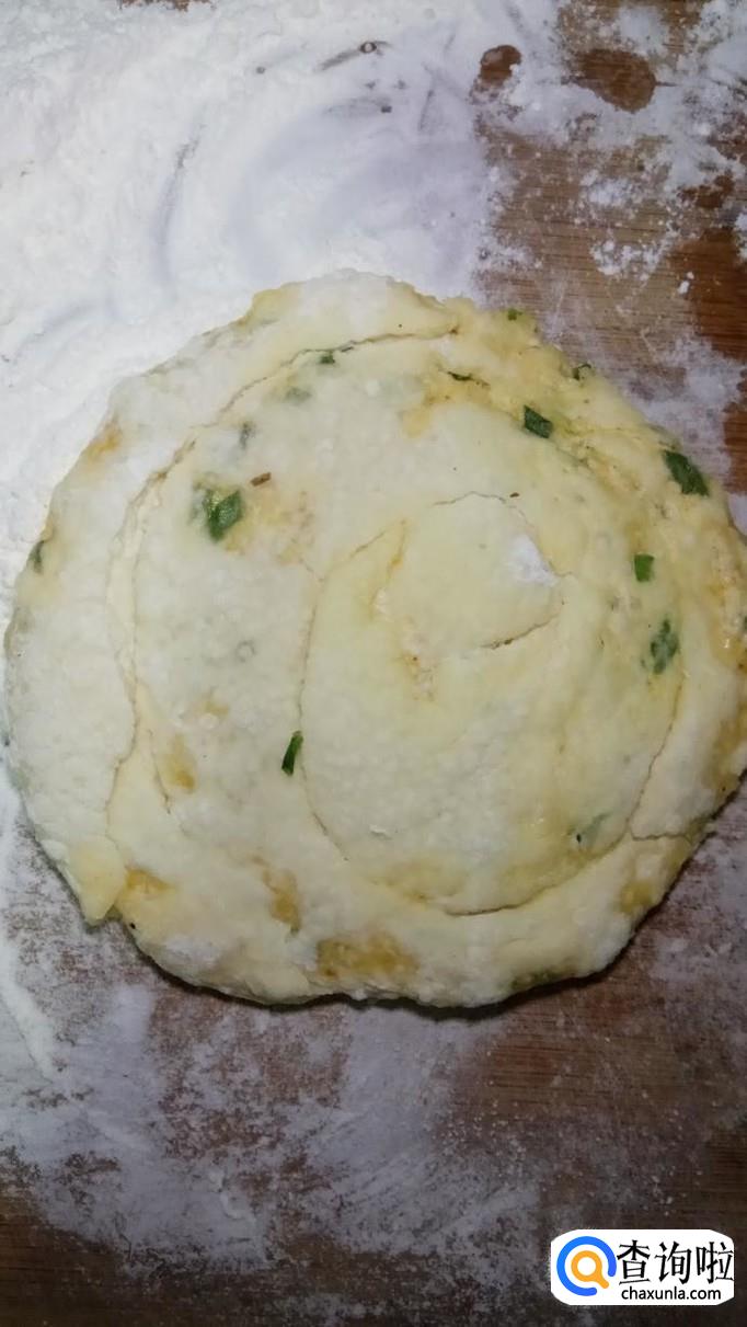 现在的天气比较暖和,两三个小时面团就发酵至两倍大了,再用手揉一下,取出适量,擀成面片,尽量做成圆形。