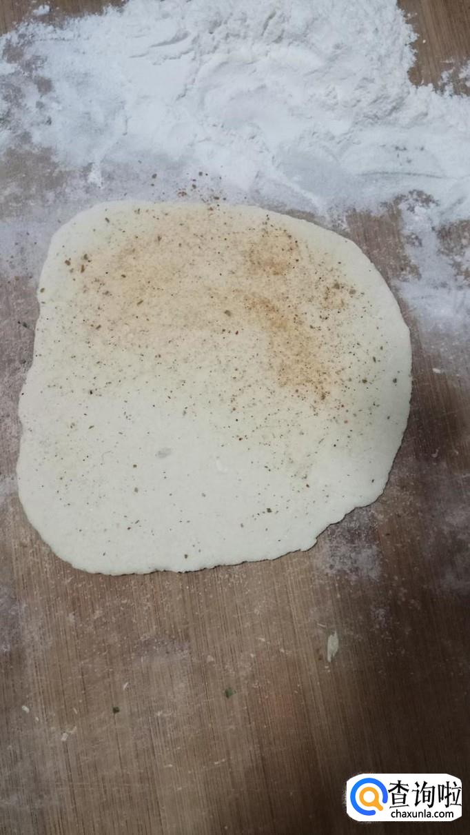 再面片上撒上适量盐,五香粉,用手搓开,撒上适量的熟的食用油,在食用油上再撒上干面粉,用勺子搅拌开,这就是油酥。