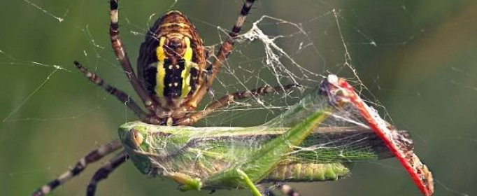 当空中飞舞的小虫误撞到蛛网上便被粘住。蜘蛛爬向前去,用钳角里的毒液,将猎获物毒痹,然后吐出―种酵素消化液,注入猎获物体内,待这种能溶解蛋白质的消化液将虫体的内部组织完全变成汁液之后,再进行吮食。因此蜘蛛吃剩下来的昆虫的空体壳,就被完整地弃留在蜘蛛网上了。