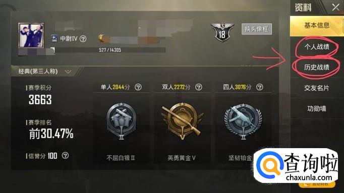 点击头像之后,会跳出来你的个人资料,基本信息下面圈出来的就是你自己的个人战绩和历史战绩,想查看什么就点击什么