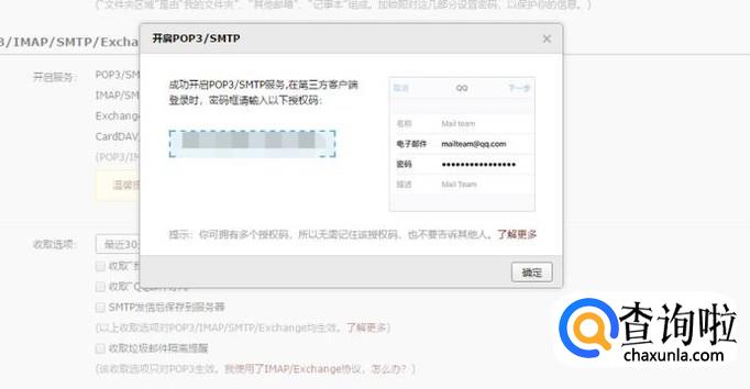 之后会显示你已经成功开启POP3/SMTP服务,在第三方客户端登录时,需要在密码框输入的授权码,要暂时记住这个授权码。