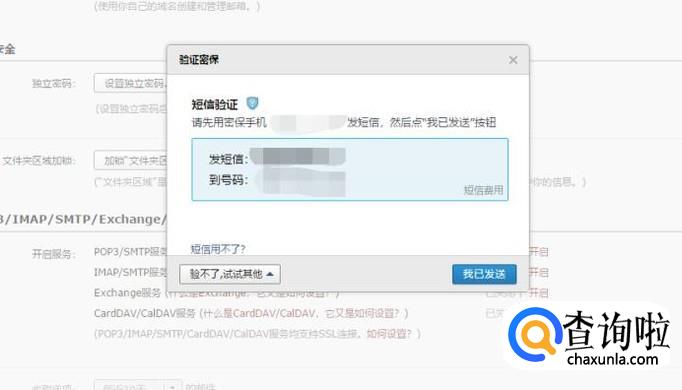 在开启IWAP/POP3/SMTP服务这一步时,需要用你的电子邮箱所绑定的手机号码进行短信验证,根据要求发送短信至固定号码,再点击“我已发送”。