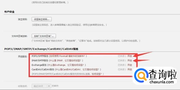 下滑滚动条,直到找到如图所示的相关选项。在这里,点击前两个选项中的“开启”,就可以开启你的邮箱的IWAP/POP3/SMTP服务。