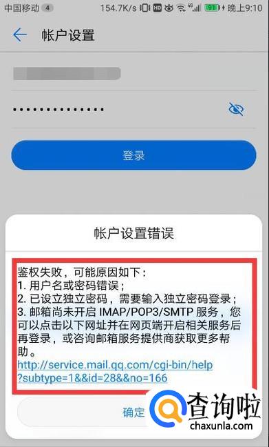 但是当你正确输入了电子邮件的账户的帐号和密码后,可能会跳出如图所示的提示。跳出这条提示的原因往往是你的邮箱尚未开启IWAP/POP3/SMTP服务,那么应该如何开启呢?