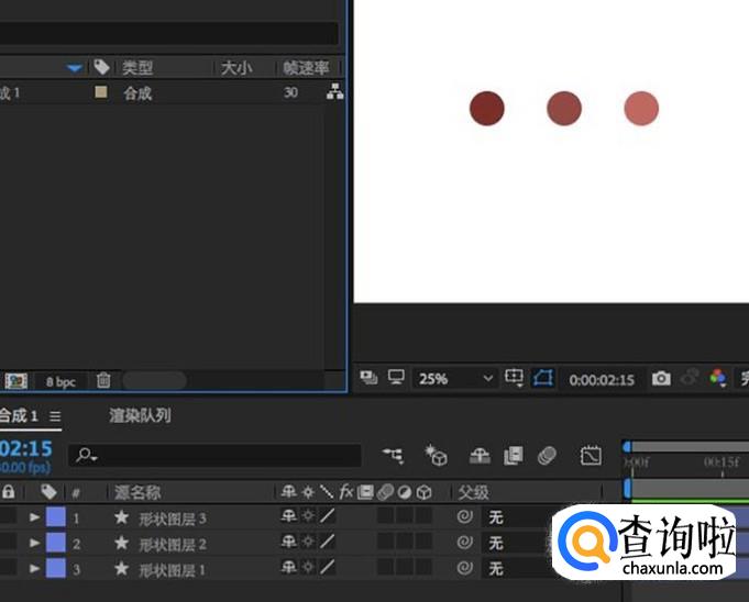 创建合成之后我们添加三个不同颜色的圆形来进行实验,需要注意的是,一定要是3个不同的图层,不能在同一个图层中添加。