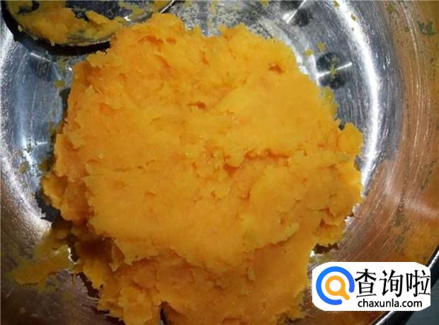 蒸软的南瓜用大勺子压碎,越碎越好,把蒸南瓜的水给倒掉。