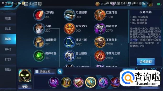 出装三:极寒风暴。为什么会出极寒风暴呢?因为极寒风暴是唯一被动冰心,太乙真人利用极寒风暴可以降低敌人的攻击速度和移动速度。