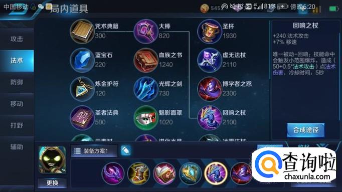 出装四:回响之杖。为什么会出回响之杖呢?因为回响之杖是唯一被动回响,太乙真人利用回响之杖会触发小范围爆炸,造成法术伤害。