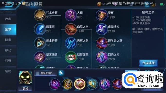 出装二:噬神之书。为什么会出噬神之书呢?因为噬神之书是唯一被动嗜血,太乙真人利用噬神之书可以增加25%法术吸血。