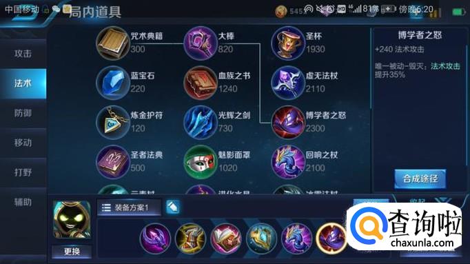 出装五:博学者之怒。为什么会出博学者之怒呢?因为博学者之怒是唯一被动毁灭,太乙真人利用博学者之怒可以增加35%法术攻击。