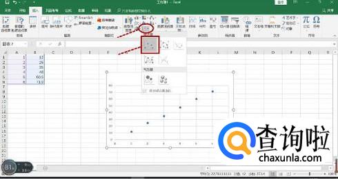 在插入菜单下选择插入散点图,弹出如图所示的一个散点图,再选择散点图。