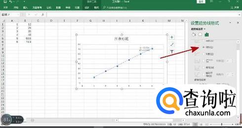 在右边弹出的“添加趋势线格式”栏中分别选中“线性”、“设置截距”、“显示公式”、“显示R平方值”等你需要的项目。