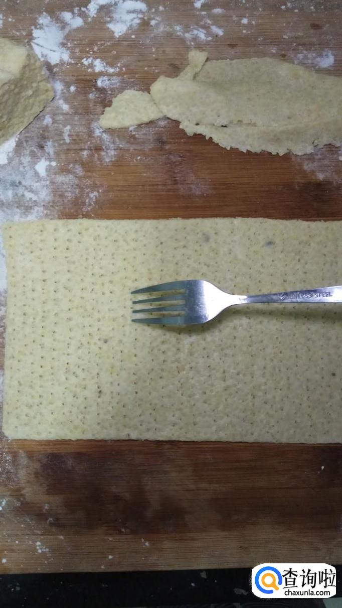 将面团擀成非常薄的片,然后将边缘裁好,用叉子叉出小圆圈,切成长方形,如图所示。