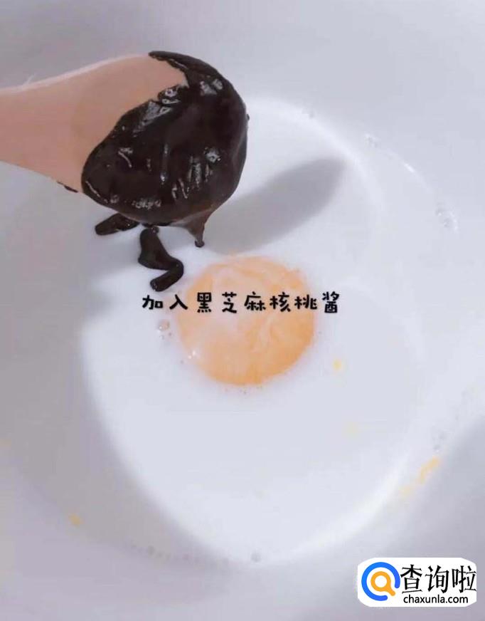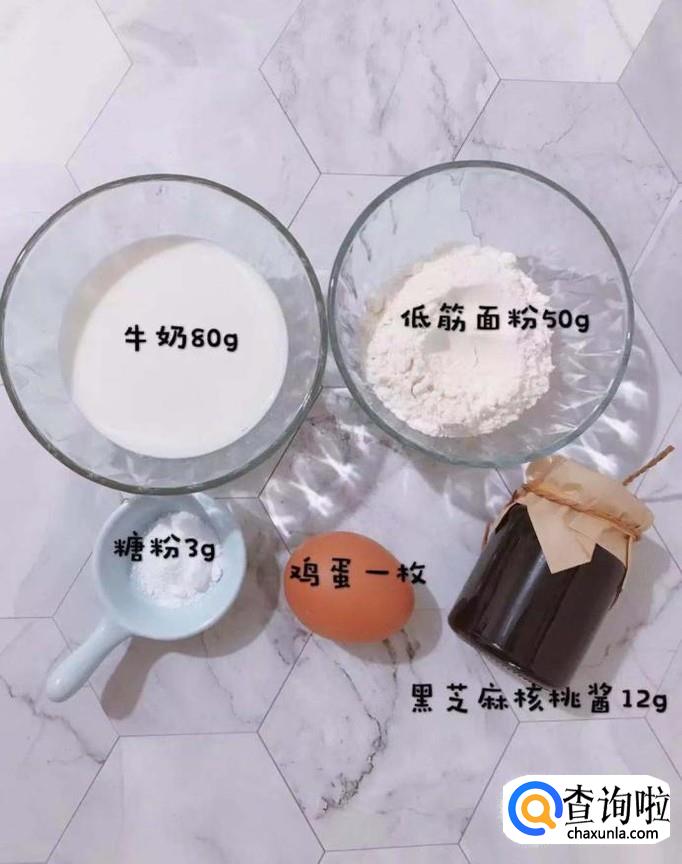 食材:牛奶80克,低筋面粉50克,糖粉3克,鸡蛋一粒,黑芝麻核桃酱12克。