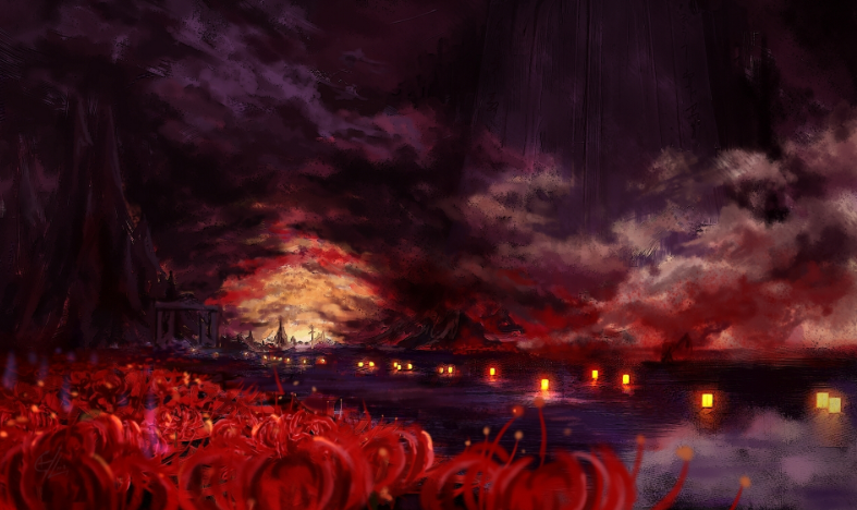 为了能一起,他们两人逃到了阴间的忘川水,可是忘川水中的倒影却让孟婆看到了自己丑陋的样子,孟婆无法面对白己,便默默走掉,而月老却一直在追逐她.脚下生出的荆棘,刺的月老脚底流出了鲜血,在冥府之中开出了一朵朵的红花,也就是曼珠沙华(彼岸花)。