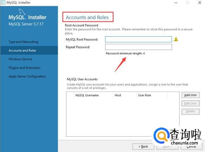 上面是设置最高权限的密码,这个密码很重要,务必设置一个不容易被破解的。下面是用户设置,这个在以后添加删除用户也是可以了,安装的时候可以忽略。然后点下一步。