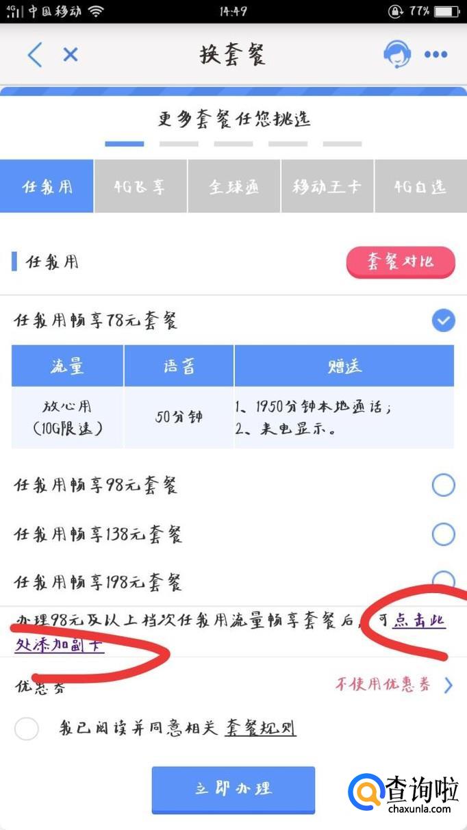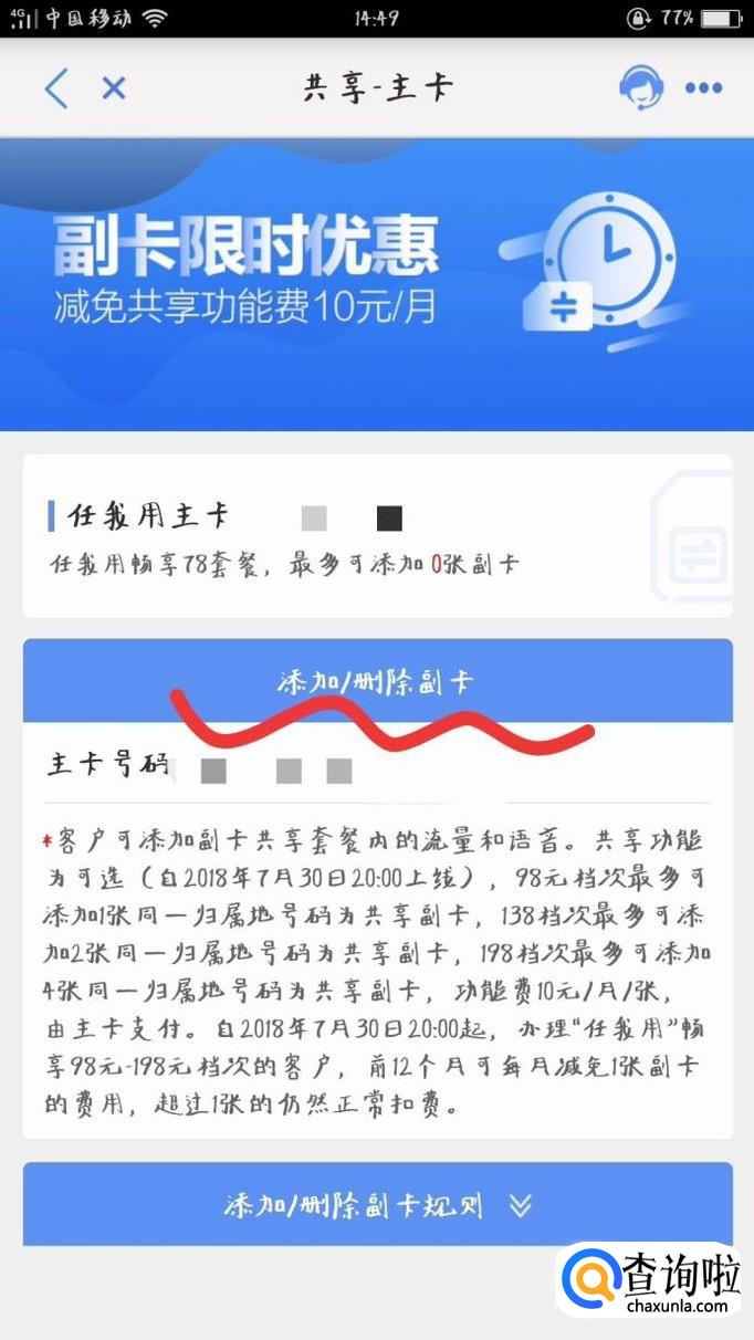 若你的手机套餐为98元及以上者,直接点击“添加副卡”,若套餐为98元以下需要先更换套餐。