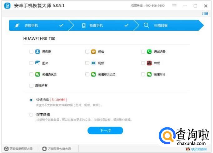 软件识别并连接三星手机后,界面上会弹出选择数据类型的方框,在上面我们可以看到有短信,通话记录,通讯录,照片,聊天记录等多种数据,选择其中我们要恢复的照片勾选。点击下一步进入扫描。