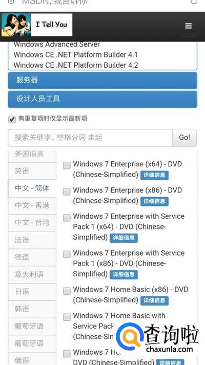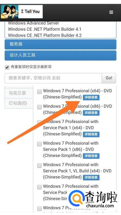 接下来找到我们需要下载的操作系统版本,在这里我们选择下载简体中文的Windows 7旗舰版。选择好后,点击系统版本名称对应的“详细信息”。