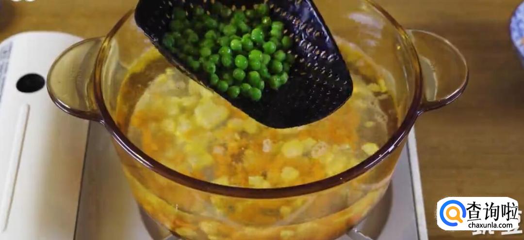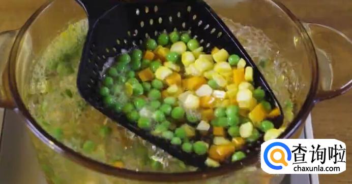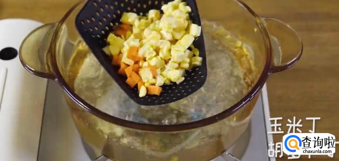 将水烧开,放入适当的盐,然后将玉米丁、胡萝卜丁和豌豆倒入水中焯水。