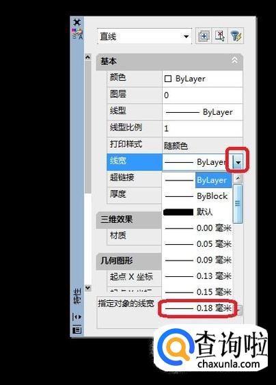 在特性面板中,我们看到,在“基本”栏下有“线宽”设置选项,我们点击下拉菜单箭头,就可以设置线宽了。