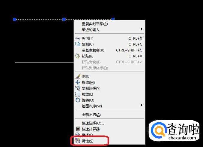 当前,上下两条线条是同样粗细的,我们点击选中其中一条,如图所示,右键点击选择“特性”。