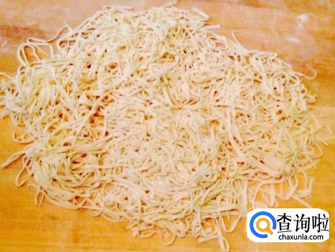 案板铺撒干面粉把醒好的面团用擀面杖擀成厚薄均匀的大面皮,然后切成出粗细均匀的面条即可