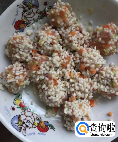 将搅拌好的肉馅团成丸子,然后滚上一层泡好的糯米。