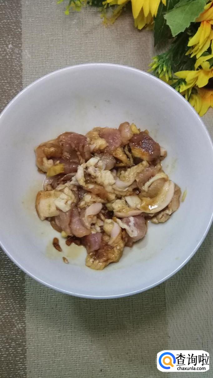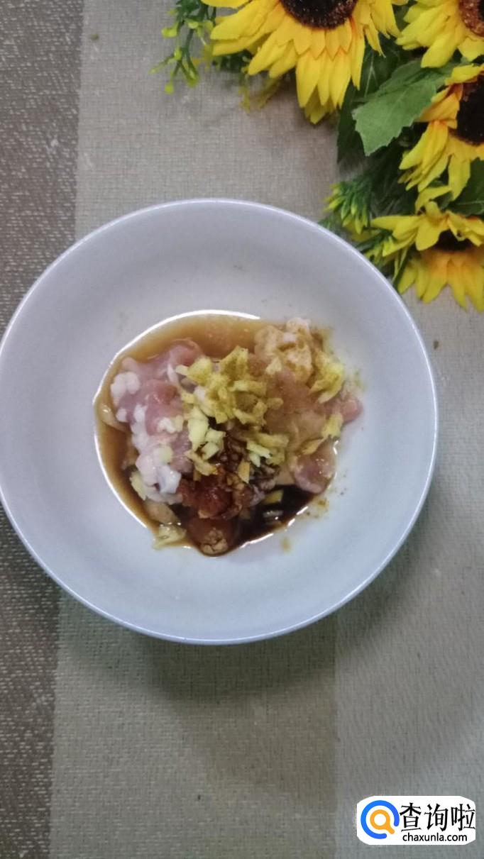 再准备适量五花肉,放入适量盐,鸡精,五香粉,生姜碎,老抽,腌制半个小时,这样更加入味。