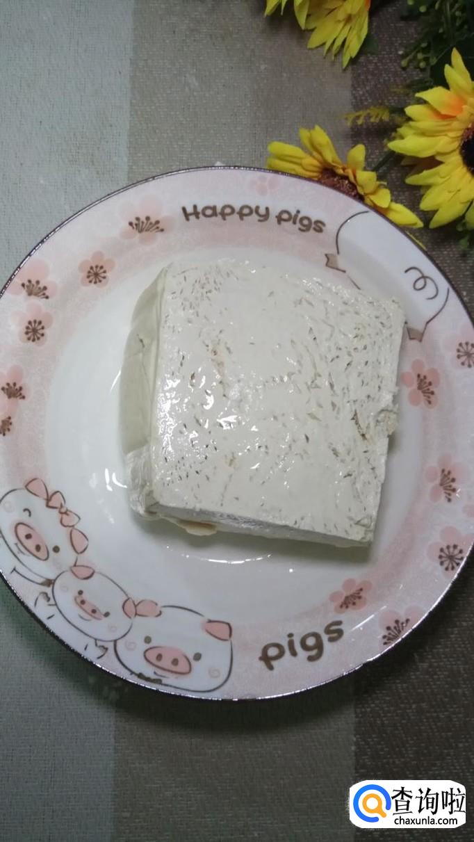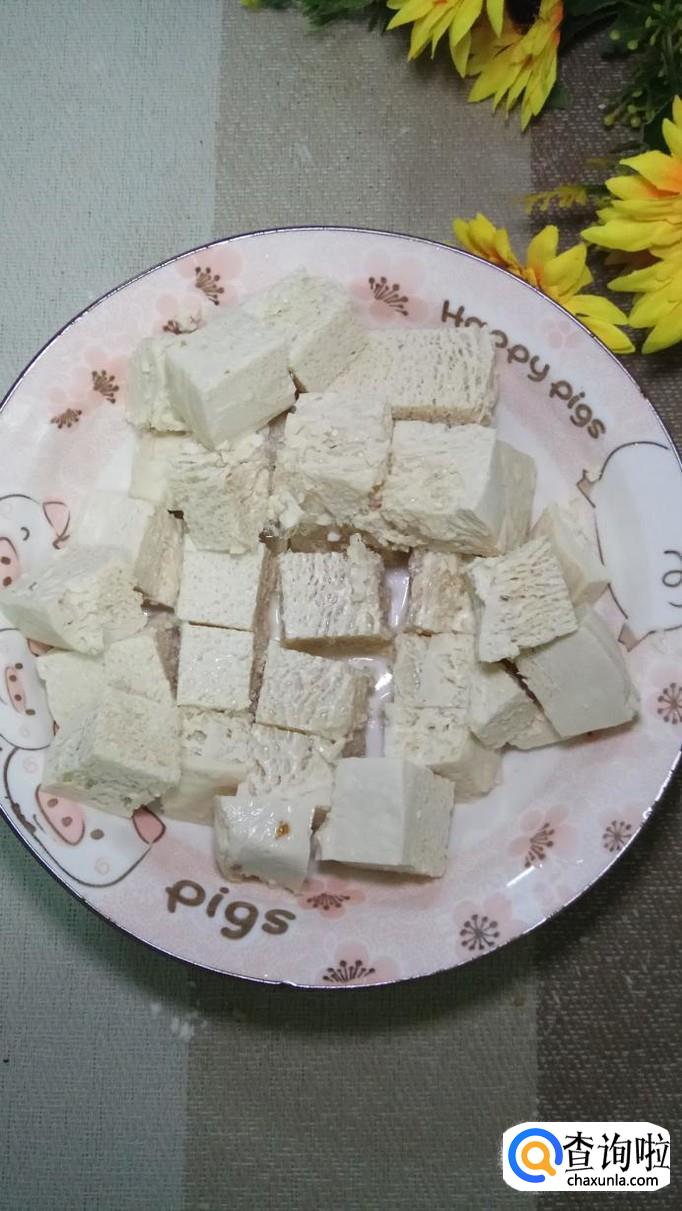 将豆腐放入冰箱冷冻一夜,取出后切成大块,如图所示。