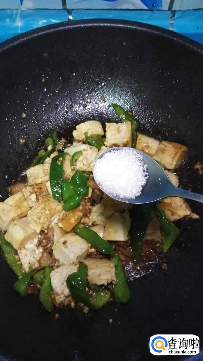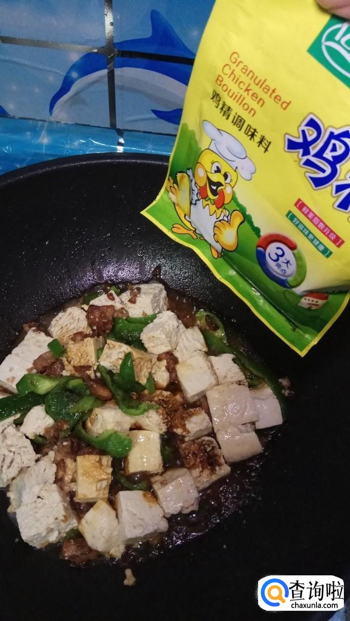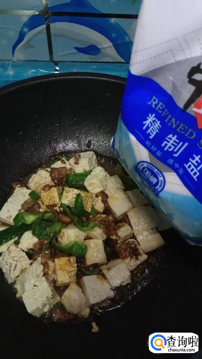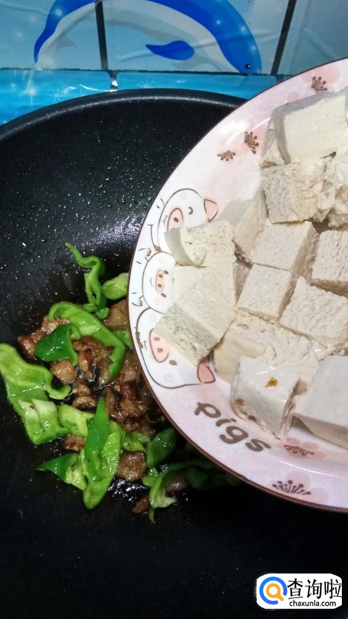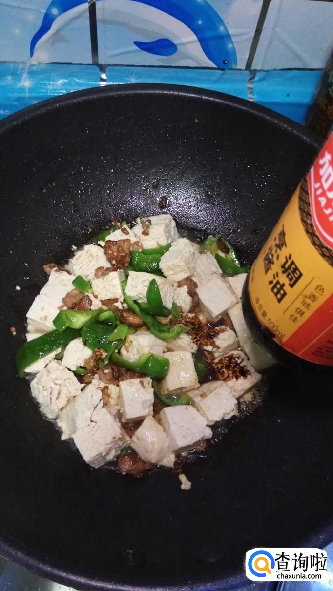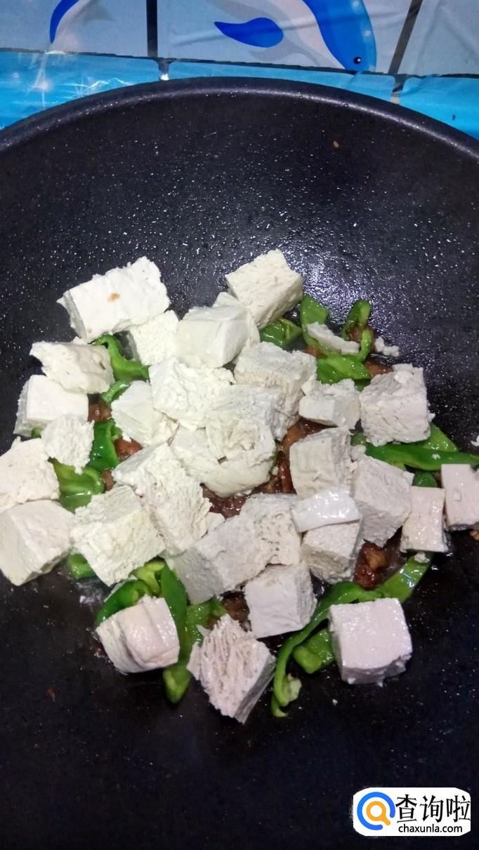将准备好的豆腐块倒入锅中,进行翻炒。