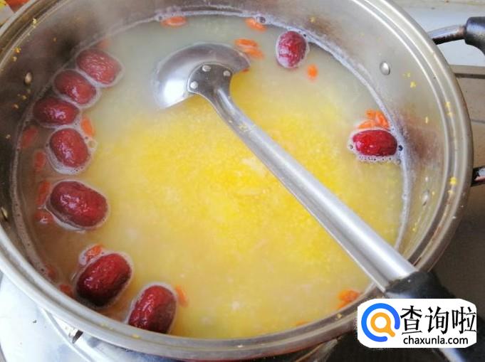 然后可以加入所备好的枸杞、红枣、百合,都加好后盖上锅盖,点火煮粥,开锅后改小火慢熬,勤用勺子搅拌以免糊锅底。