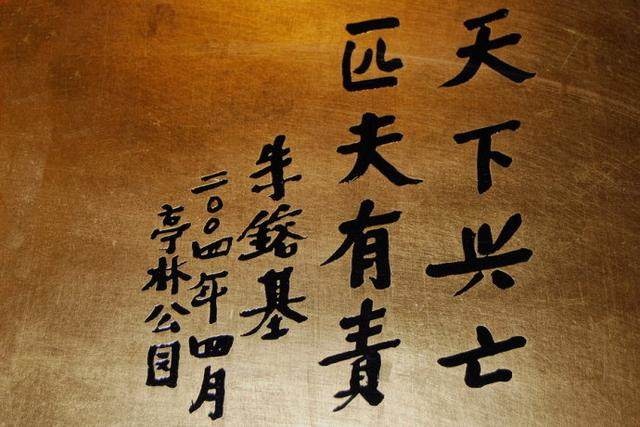 在民国时期梁启超对顾炎武的推崇最高,被尊称“人师”,其《饮冰室合集》中他这样写到:“夫以数千年文明之中国,人民之众甲大地,而不免近于禽兽,其谁之耻欤?顾亭林曰:天下兴亡,匹夫之贱,与有责焉已耳!”至此八字句成,语意本出自顾炎武。