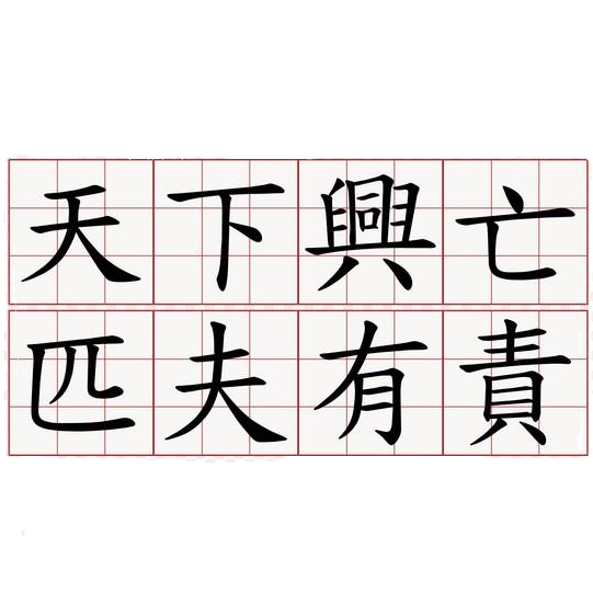 “天下兴亡,匹夫有责”这句话最早是在顾炎武的《日知录·正始》中提出的概念,背景是清军入关。原句是:“保国者,其君其臣肉食者谋之;保天下者,匹夫之贱与有责焉耳矣。”以八字成文的语型,出自梁启超。