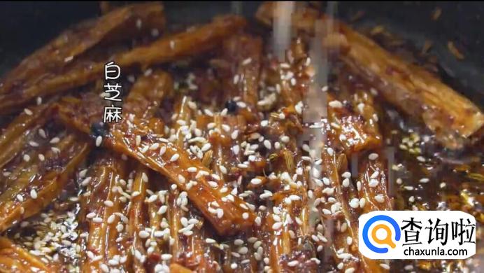 加一点水,再加入盐、白糖、白芝麻,炒匀。