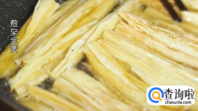 锅中倒油,放入泡好的腐竹,煎至金黄后捞出。