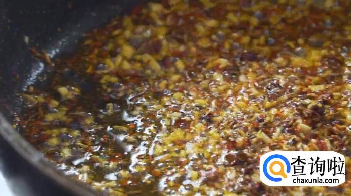 再倒油,放入蒜末、花椒、孜然、茴香、辣椒粉。