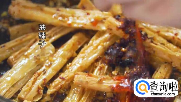 然后放入腐竹,小火炒制,再放入油辣子。
