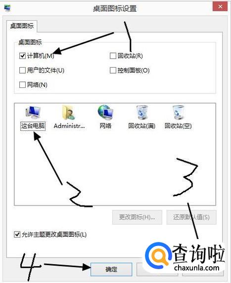 接着就会出现怎么图标设置页面,我们在计算机那里打钩,再点击其图标,再点击应用,最后点击确定就设置完成了。这时候退出到桌面看,就会有电脑的图标了。
