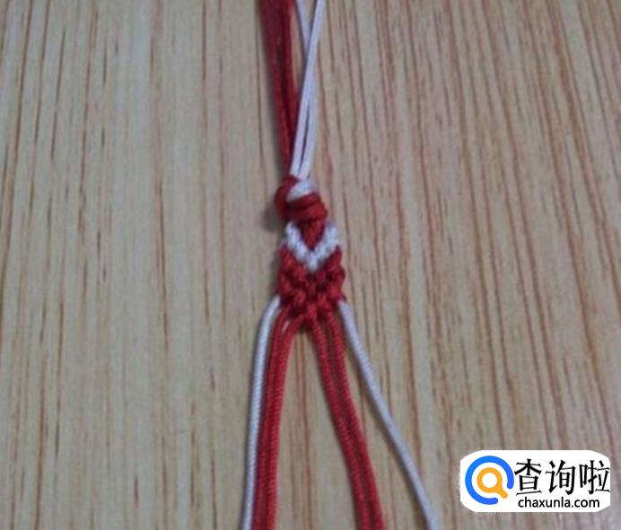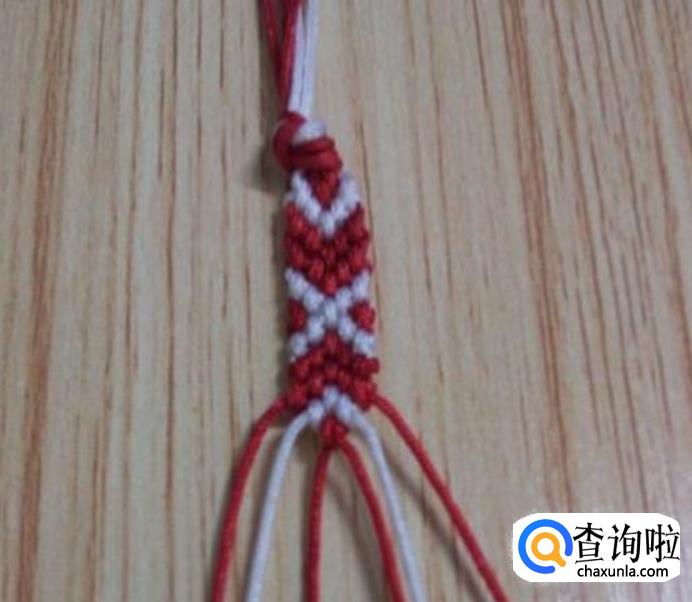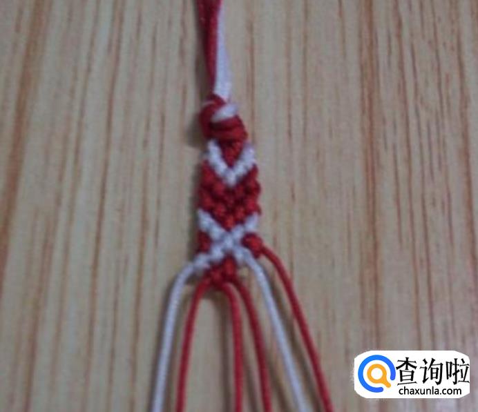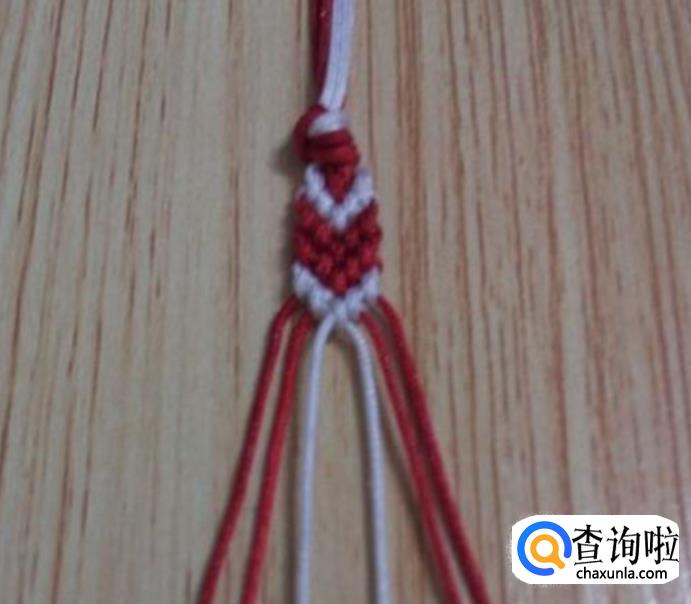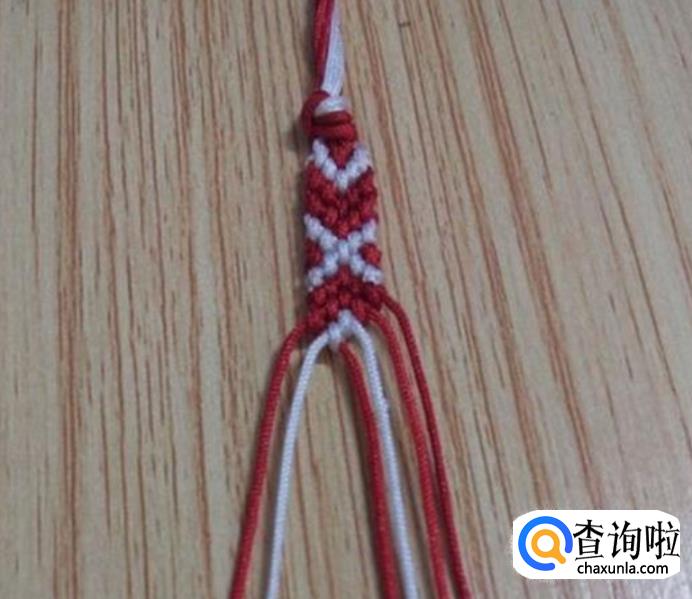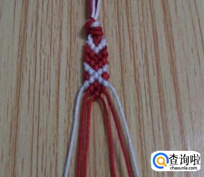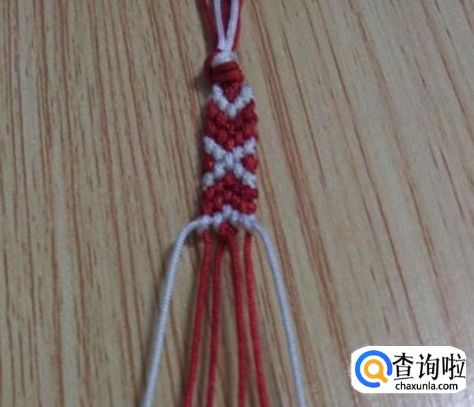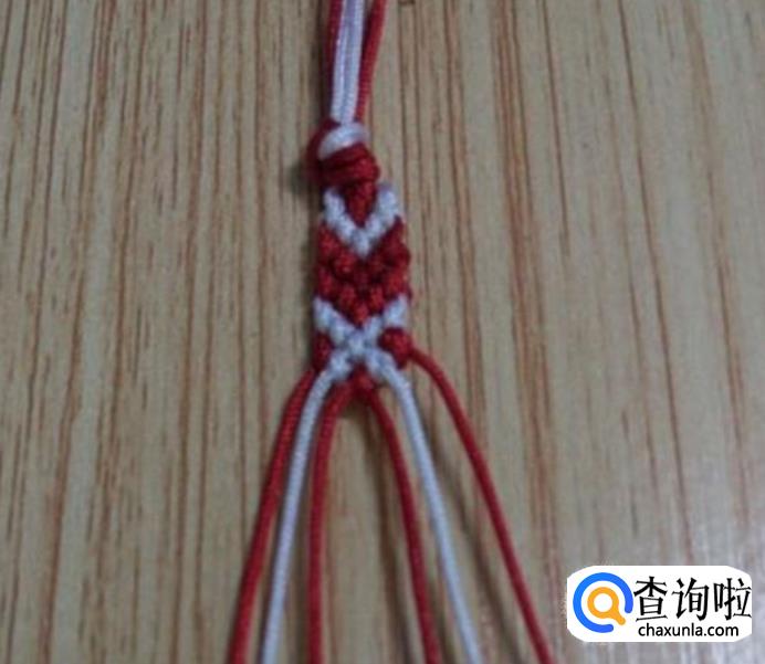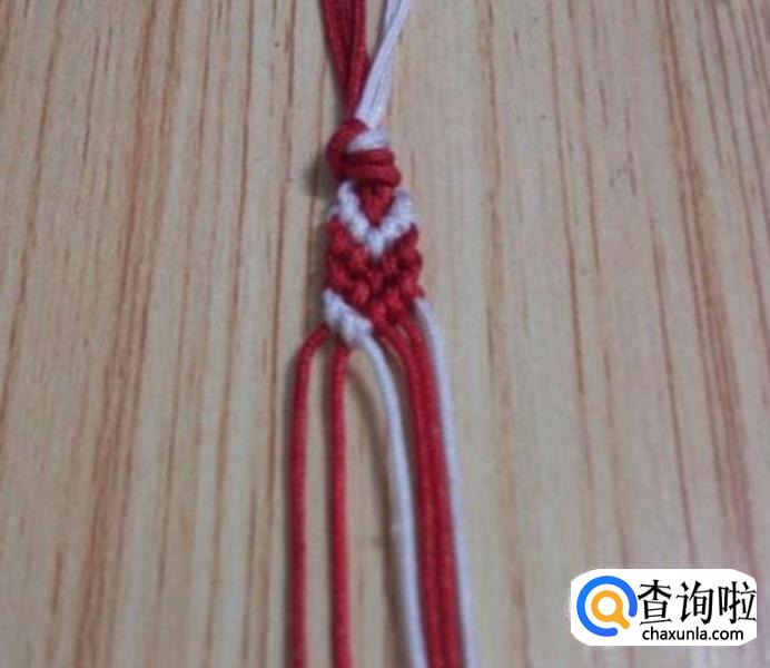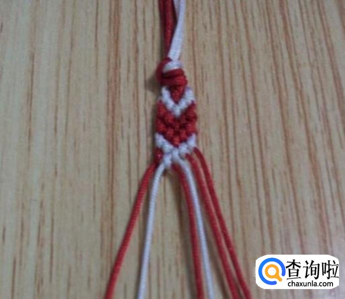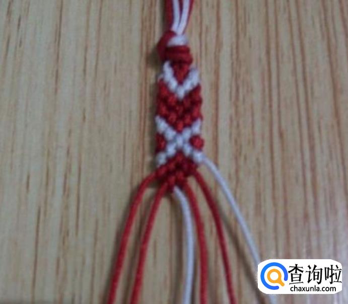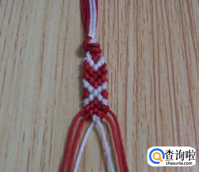 接下来,从左边顺数的第一根红线为轴线,第二根白线编一个斜卷结,编好后,再编右边,同左边一样,从右边顺数的第一根红线为轴线,第二根白线编一个斜卷结,编好后,如图所示,这就是一个小单元,看现在编好后线的颜色位置与第一步骤的颜色位置是相同的,即依次重复步骤2.3.4.5.6.7.8.9.10.11等,编到合适的长度就可以收尾了。